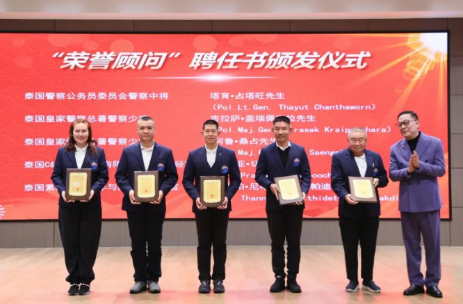 仪式上,陈杰克主席还向塔育·占塔旺警察中将、吉拉萨·盖瑞佩查拉警察少将等五位来自泰国政府与企业的杰出人士颁发了“荣誉顾问”聘任书,进一步夯实了委员会在政策协调与实务推动方面的资源基础。
