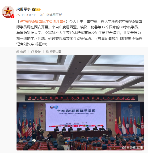 今天上午,由空军工程大学承办的空军第6届国际学员周在西安开幕。来自印度尼西亚、埃及、秘鲁等17个国家的30余名学员,与国防科技大学、空军航空大学等10余所军事院校的学员混合编组,共同开展为期一周的学习训练、研讨交流和文化互动等活动。(总台记者钱江 陈雨鑫 李板程 记者刘汉帝 杨正中)